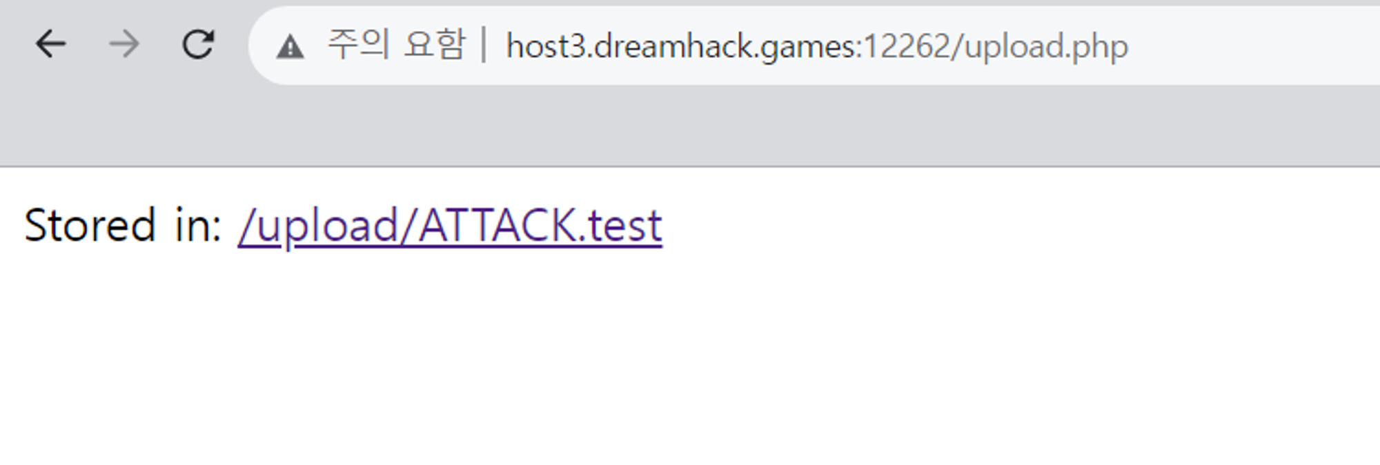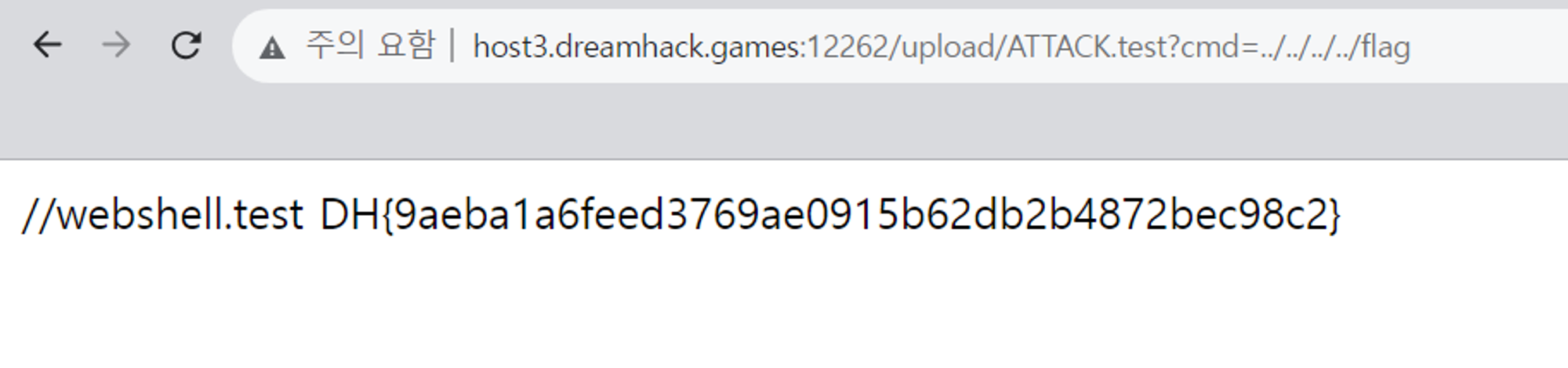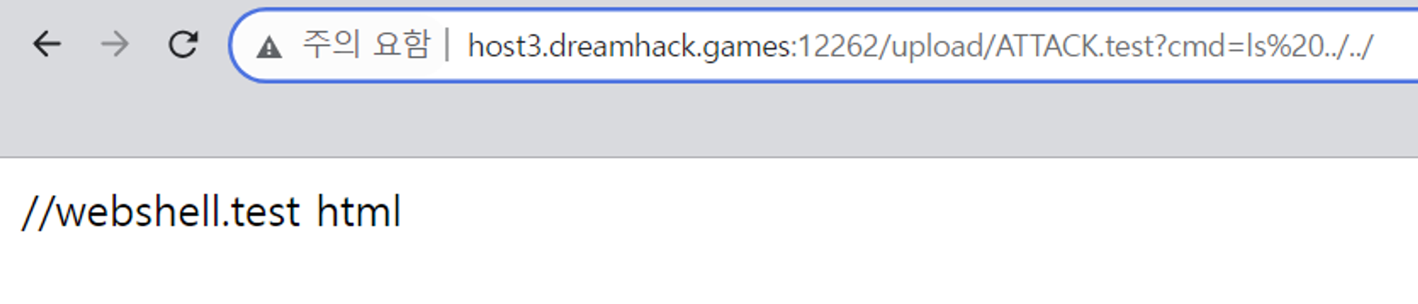 - .htaccess 파일로 확장자 우회를 했기 때문에, .test확장자 파일에 담긴 php코드는 성공적으로 웹 서버에 업로드되고, 웹 서버에 웹 쉘을 실행하게 됨