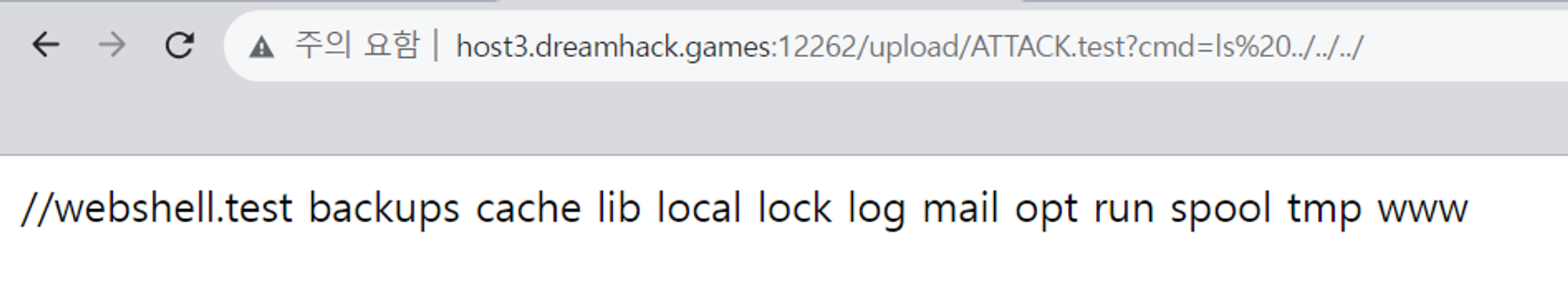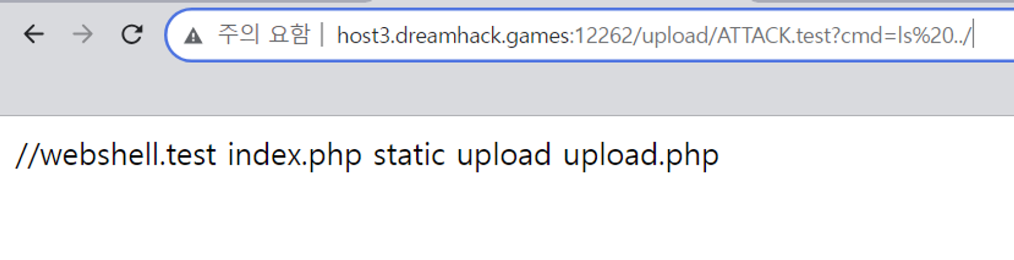 그렇다면 이제 ATTACK.test 파일에는 웹 쉘을 실행시키는 php코드가 있으므로, 저 경로에 들어가 url창에 ‘.php?cmd=명령어’ 이런식으로 cmd 명령어를 실행시킬 수 있을 것이다.
