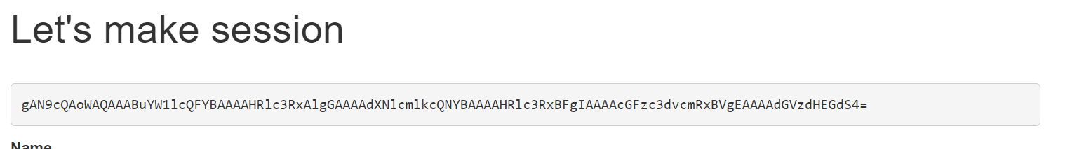 그리고 9번째 줄은 위에서 설명한대로 base64로 인코딩 된 값을 세션을 조회하는데 사용하기 때문에 문제의 소스코드에서 사용한 방법 그대로 base64로 인코딩해서 코드 값을 만들어주면 우리가 원하는 코드를 담고있는 세션 base64코드 값이 출력 되고 그 값을 세션 조회 페이지에 조회하면 name인자 값에 flag.txt 내용이 출력되게 될 것이다.