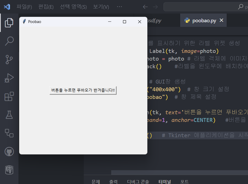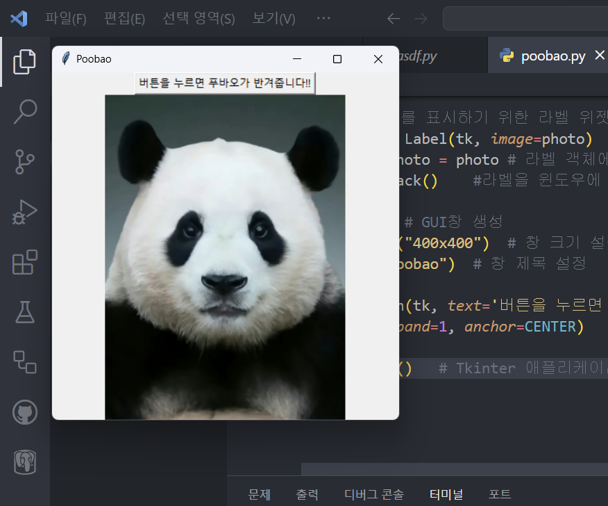 btn = Button(tk, text='버튼을 누르면 푸바오가 반겨줍니다!!', command=clickbtn) #버튼 생성, 버튼 누를 때 실행 할 함수 지정
